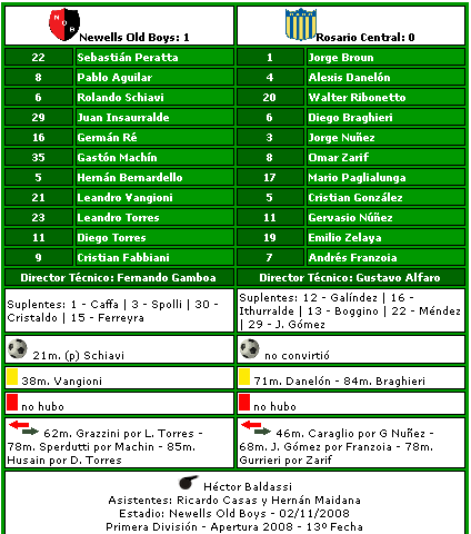 GOL: FAUSTINO GONZALEZ (S.T.) En una acelerada a fondo, el quinteto de ataque rojinegro comandado por Victor Heitz, derivó en los pies de Faustino Gonzalez, que desde muy corta distancia venció a Norris, quien se arrojó, sin llegar a ni siquiera desviar la trayectoria, que culminó en el fondo de la valla centralista, convirtiéndose en el único goal del match, dándole la victoria a los VIejos Muchachos de Newell's, sobre los antes bien llamados Talleres. (Relato de la época- El gran libro del Clásico)