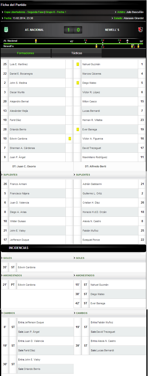 MULTIPLE DEBUT COPERO: El franco argentino David Treseguet jugó su primer partido en una Copa Libertadores de América desde su llegada a la Argentina. Lo propio pasó con Alexis Castro que nunca había jugado un partido Internacional. Por su parte Alfredo Berti debuta como DT y dirige su primer partidos de Copa Libertadores. En tanto Ever Banega lo hace por primera vez con la camiseta de Newells ya que jugó 14 partidos de Copa con la casaca xeneise.
