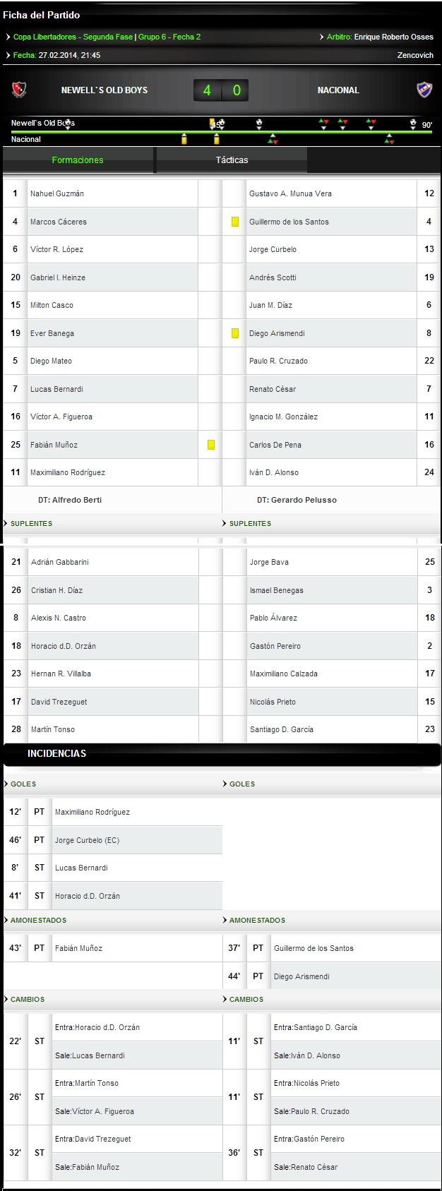 DEBUT COPERO EN LA RED: Lucas Bernardi convierte su primer gol en un Torneo de Copa Libertadores. LLeva jugado 12 partidos. En total acumula 6 goles con la camiseta rojinegra en partidos oficiales. Por su parte Maxi Rodriguez convierte su primer gol en este torneo, suma 4 por Copas Libertadores y llega a 37goles en su haber personal con la casaca leprosa, de esta manera se prende en la tabla de goleadores históricos por Copa Libertadores igualando a Julio Zamora y Pochetino, detrás de Scocco (10), Mendoza (6) y Rossi y Giachelo (5). En tanto Orzán convierte su 2º gol en un torneo internacional. El anterior se lo había convertido a Olimpia de Paraguay decretando el 3-1 definitivo aquel 14/02/2013 por la primera fecha del grupo 7 en el Coloso Marcelo Bielsa, y alcanza los 5 goles con la camiseta de Newell's en partidos oficiales.