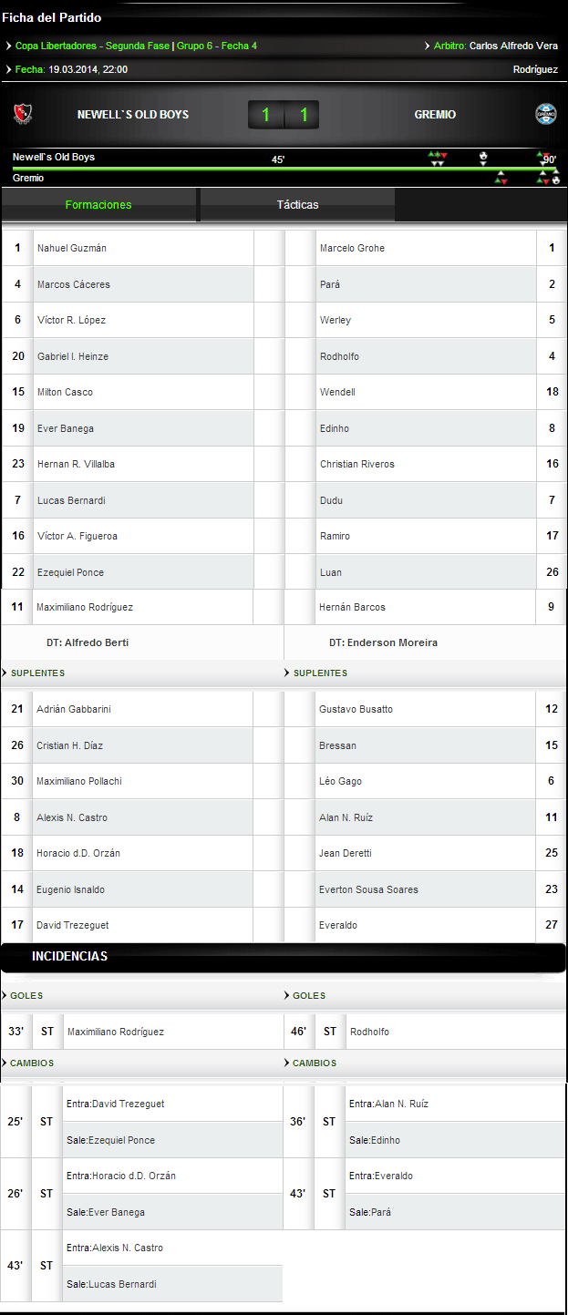NUMEROS REDONDOS: El mudo Villalba jugó su partido Nº 10 en Copa Libertadores con la casaca rojinegra, aún sin goles. 10 son también la cantidad de partidos que ha empatado la lepra en estos 72 encuentros de Copa Libertadores. Y 10 son los encuentros disputados por: Ever Banegas desde su debut en Newell's (6 en AFA y 4 por Copa), Alexis Castro ( 7 AFA, 3 COPA) y Ezequiel Ponce (8 AFA, 2 COPA) este último con un gol en su haber frente a Racing. Por su parte Horacio Orzán jugó frente a Gremio su partido Nº 50 con la camiseta rojinegra (37 AFA, 11 COPA LIB, 2 COPA ARG).