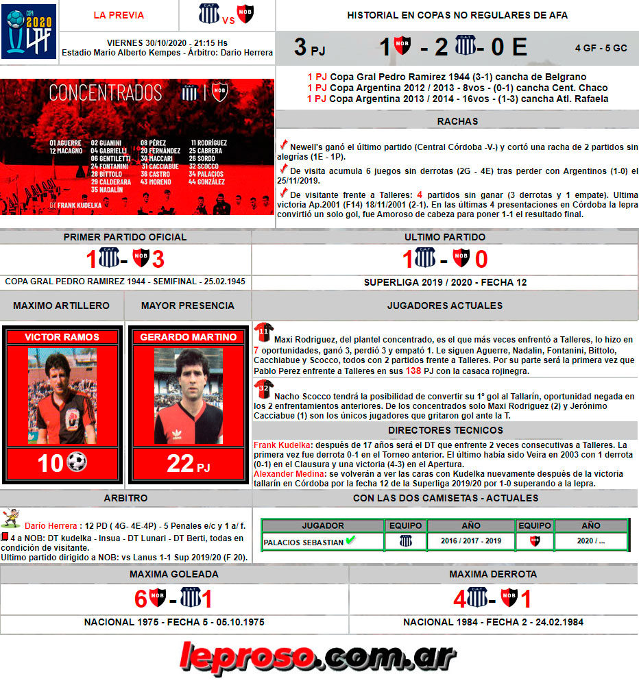 De visitante acumulaba 6 juegos sin derrotas (2G - 4E) tras perder con Argentinos (1-0) el 25/11/2019. De visitante frente a Talleres: 5 partidos sin ganar (4 derrotas y 1 empate). Ultima victoria Ap.2001 (F14) .......18/11/2001 (2-1). En las últimas 4 presentaciones en Córdoba la lepra convirtió solo 2 goles y ambos de .......cabeza, Amoroso en 2013 y Scocco en 2020.