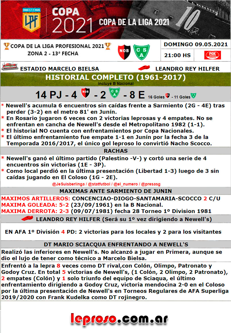 DT MARIO SCIACQUA: Realizó las inferiores en Newell's. No alcanzó a jugar en Primera, aunque se dio el lujo de tener como técnico a Marcelo Bielsa. Enfrentó a la lepra 9 veces como DT rival, con Colón, Olimpo, Patronato, Godoy Cruz y ahora con Sarmiento de Junín. En total 5 victorias de Newell's, (1 Colón, 2 Olimpo, 2 Patronato), 3 empates (2 Colón, 1 Sarmiento) y 1 solo triunfo del equipo de Sciaqua (último enfrentamiento dirigiendo a Godoy Cruz, victoria mendocina 2-0 en el Coloso por la última presentación de Newell's en Torneos Regulares de AFA Superliga 2019/2020 con Frank Kudelka como DT rojinegro).