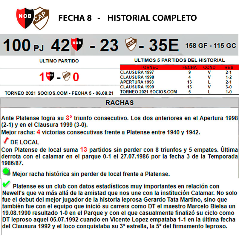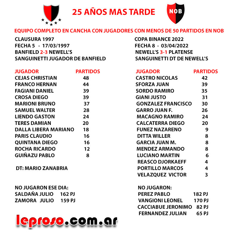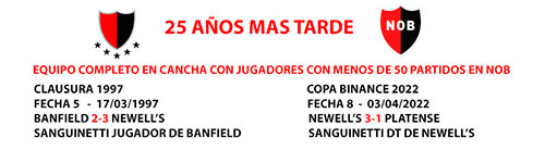 El desgarro de Lema, las ausencias de Vangioni y Cacciabue y las 5 tarjetas amarillas de Perez y Fernandez, generaron un hecho poco común en el nuevo milenio de Newell's. Los 16 jugadores que estuvieron en cancha frente a Platense, tienen menos de 50 partidos en la institución rojinegra. Esto no se daba desde el año 1997 . Fue en la fecha 5 del Clausura 1997 cuando en Banfield, la lepra venció por 3-2 con Zanabria como DT rojinegro y Sanguinetti como jugador del taladro. En esa oportunidad no jugaron los históricos Saldaña y Zamora que se encontraban activos en ese torneo. Pasaron 25 años porque siempre durante ese lapzo, al menos un referente se encontraba en cancha, Perez, Vangioni, Maxi, Scocco, Formica, Mateo, Bernardi, Peratta, Re, Villar Justo, Spolli, Manso, Vella, Bernardello, Dominguez, Rosales Mauro, Ponzio, Saldaña, Cejas, Crosa F, Crosa D y Zamora entre otros. |