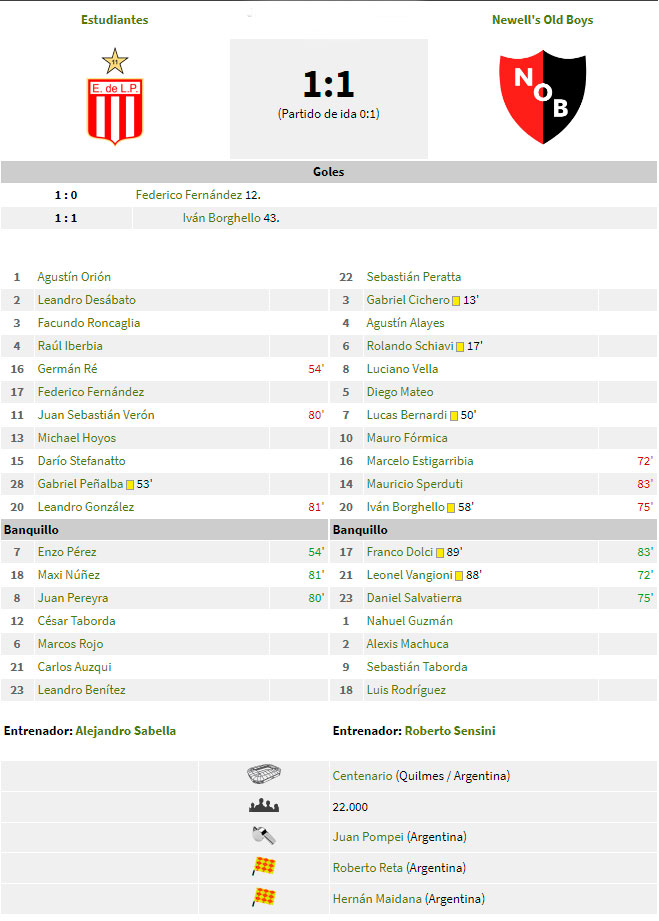1-1: en 14 oportunidades Newell's empató con este marcador por Torneos Internacionales, es el 10 º de ........visitante y el 4º con un equipo Argentino. Los tres primeros fueron con Central (dos veces por Copa ........Libertadores 1975), con San Lorenzo en cancha de Ferro (Copa Libertadores 1992) y ahora con Estudiantes
