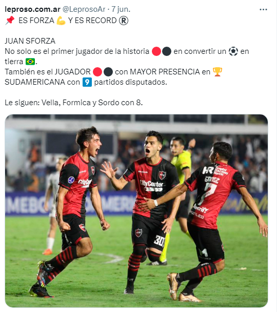 JUAN SFORZA : jugó ante Blooming su 9º partido por Copa Sudamericana y de esta manera se convierte en el jugador rojinegro con mayor presencia por Copa Sudamericana de la historia. Además abrió el marcador en el minuto 45' +1' y de esta manera se convierte en el primer jugador rojinegro de la historia en convertir un gol en tierras brasileras. AMPLIAR |