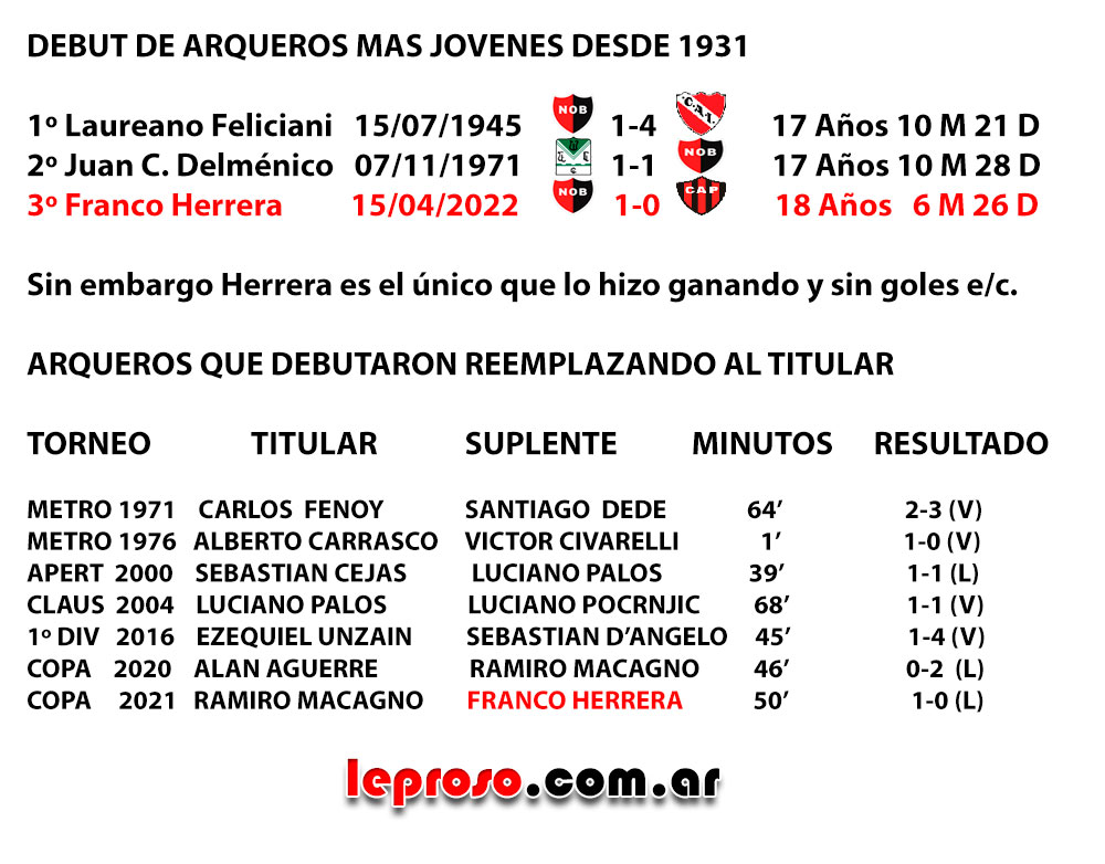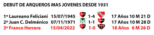 ARQUERO MAS JOVEN EN DISPUTAR UN CLASICO ROSARINO: fue el 21.07.2022 con 18 años 10 meses y 2 días. Con 140' en primera, y por lesión de Ramiro Macagno, el juvenil Franco Herrera tuvo que afrontar el clásico y de visitante. Un cabezazo certero de otro partido, terminó con su invicto desde su debut que llegó a 183'.