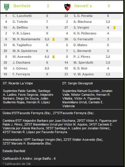 Facundo Ferreyra convirtió los dos goles del taladro. El último jugador contrario que gritó dos goles en un partido frente a la lepra había sido Teófilo Gutierrez de Racing en el Clausura 2011 cuando el rojinegro cayó derrotado 3-0. En lo que va del año también le convirtieron 2 goles en un partido, el ex-lepra Nicolás Cabrera con la casaca de Independiente (0-4), Leandro Caruso de River (1-2), y Bernardo Romeo para el cervezero (1-3).