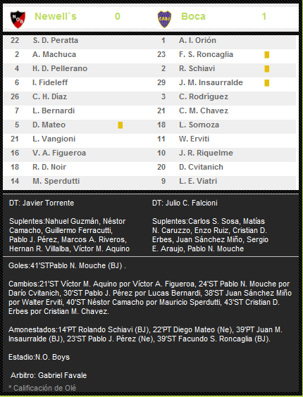 Pablo Mouche le dió el triunfo a Boca los 41' ST y de esta manera termina con el invicto de Peratta en condición de local que llegó a los 446 minutos. El flaco no pudo batir su record de AFA con la rojinegra de 453 minutos en el Clausura 2009. Entre Apertura 2009 y Copa Sudamericana llegó a los 487 minutos. Mouche le convierte a la lepra por primera vez desde su debut en primera un 23/02/2007.