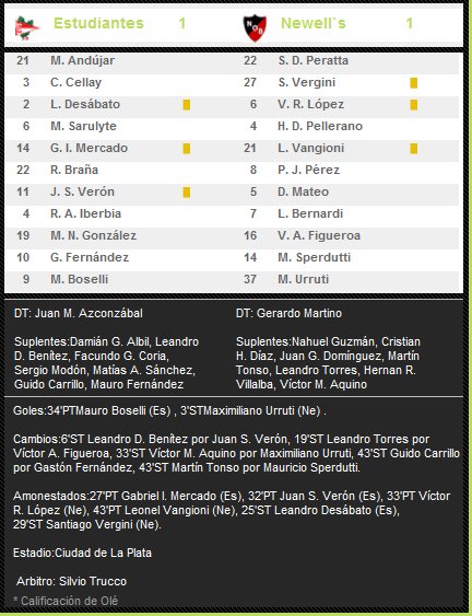GOLES: Urruti consigue su 2º gol con la camiseta rojinegra. El primero fue ante Olimpo en el Apertura 2011 (2-2). Ambos de jugada. Por su parte Mauro Boselli, autor del gol de penal, le convierte a NOB por 3º vez, el segundo con la de Estudiantes (CL 2010) y 1 gol con la casaca de Boca (AP 2004).