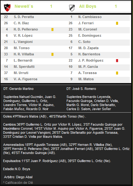 LOS GOLES: Mauro Matos abre el marcador de cabeza y le vuelve a convertir a Newell's. Ya lo había hecho en la derrota 0-2 sufrida en Buenos Aires en el Apertura 2010. De esta manera frena el reloj del invicto de Peratta en el Coloso en 327 minutos. Lejos quedó de su record personal de 487 minutos. Y cuando parecía que se moría el partido con una derrota de local, apareció Martín Tonso y con un violento derechazo la clavó en el palo izquierdo del arquero Cambiazo y puso cifras definitivas en el marcador 1-1. Tonso convirtió su 2º gol en el Torneo (el 1º fue ante COLON en Santa Fe 3-0), y en total suma 3 goles con la rojinegra.