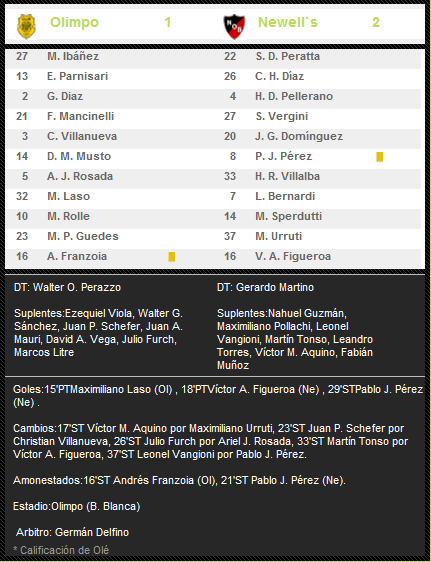 GOLES SON AMORES: Otra vez como el partido anterior, Figueroa vuelve a convertir, empata el partido y suma 2 goles con la rojinegra. Por su parte, Pablo Perez vuelve a convertir un gol importante, le da la victoria al equipo del Tata y suma 3 goles en el Clausura 2012 y 8 con la rojinegra. Del lado de Olimpo, el jugador Maximiliano Laso le convierte por primera vez a Newell's.