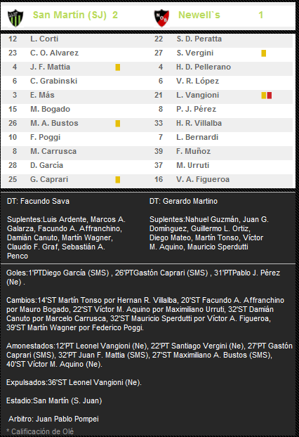 2 ROJAS DESPUES DE VARIOS TORNEOS: A los 36' ST el árbitro Pompei le mostró cartón rojo a Leonel Vangioni quien se convierte en el segundo jugador leproso en ser expulsado en este torneo. El otro fue Pellerano en la fecha 4 frente a Belgrano. La última vez que terminamos un torneo con solo 2 expulsiones fue en el Clausura 2009 (Spolli y Bernardi fueron los expulsados por Favale y Collado respectivamente), pero todavia falta el partido antes Lanús. Vangioni con esta expulsiòn suma 2 en su carrera en Newell's, la primera fue ante Tigre en la fecha 12 del Clausura 2010 a los 30'PT de la mano del árbitro Giannini.