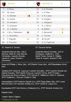 EL RESULTADO 3-0 : en torneos Cortos de AFA la lepra ganó 3-0 en 21 oportunidades, 16 de local y 5 de visitante. Con Colón es la 1º vez . El último antecedente de un 3-0 a favor de Newell's fue un 10/04/2010 por la fecha 14 del Clausura cuando le ganamos a Chacarita en el Marcelo Bielsa con 3 goles de Cristian Nuñez. En ese entonces el DT leproso era Roberto Sensini, actual técnico del sabalero. Y jugando de visitante tenemos que remontarnos al año 2003. El 24/10/2003 y por la fecha 11 del Apertura 2003, la lepra del Bambino Veyra le ganaba 3-0 en el Amalfitani nada menos que a Velez Sarfield con goles de Silvani, Bermudez y Mauro Rosales.