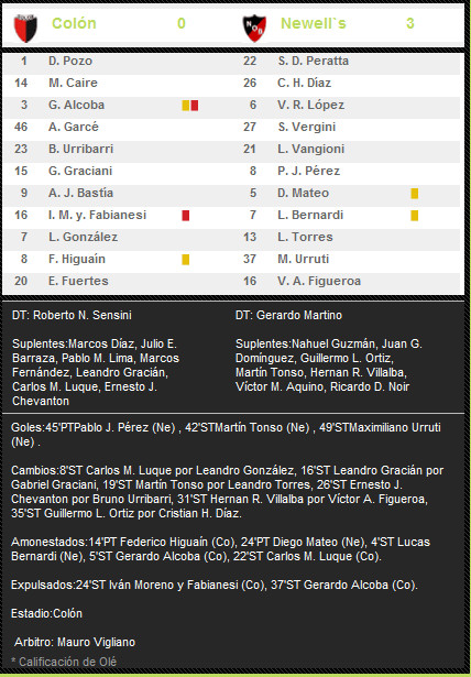 EL ARBITRO: Maura Vigliano le mostró cartón rojo a dos jugadores rivales, los primeros expulsados frente a Newells en lo que va del Torneo Clausura. El último antecedente con dos rojas a rivales fue en el la fecha 11 del Apertura 2011 cuando Toia expulsó a Burdiso y Marcone de Arsenal de Sarandí. Vigliano dirigió a NOB en 8 oportunidades con 3 triunfos 2 empates y 3 derrotas, todavía no pitó Penal ni a favor ni en contra y sí expulsó a 5 jugadores leprosos (Velazquez, Estigarribia, Sperdutti, Fideleff y el DT Torrente), y solo le mostró el cartón colorado a 3 rivales (Gigliotti de All Boys y Alcoba y Moreno y Fabianesi de Colón en el último partido)