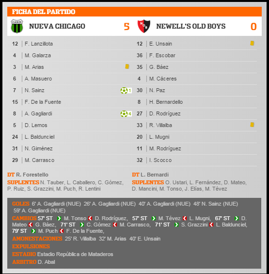 Verdugo histórico: En la historia contemporanea de Newell's en AFA, un solo jugador le había convertido 4 goles en un mismo partido. Fue Ernesto Farías, el Tecla, en la fecha 19 del Apertura 2003 en la victoria 2-4 de Estudiantes en La Plata frente a la lepra de Hector Veira con Luciano Palos en el Arco rojinegro. A los 1'PT - 18'PT - 39'PT y 25'ST. Ahora somos testigo de un nuevo Verdugo, Alejandro Gagliardi del casi descendido Nueva Chicago convirtó 4 de los 5 goles. La víctima fue Ezequiel Unsaín pero no es el culpable.