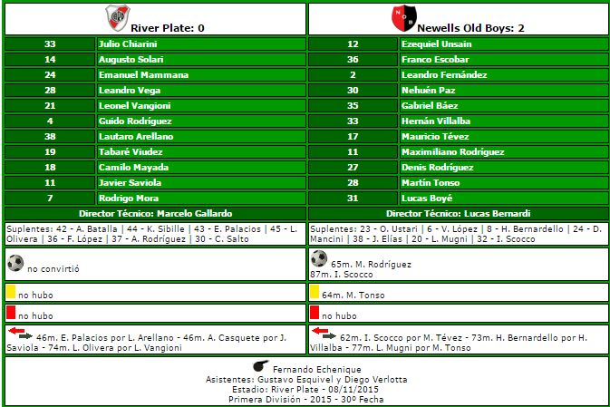 2-0: La lepra venció a River con este marcador, en 5 oportunidades, 3 de local y los dos últimos en el Monumental. El anterior fue en la fecha 3 del Apertura 2003 hace 12 años, con goles de Vazquez y Patiño, bajo la conducción técnica del Bambino Veyra.