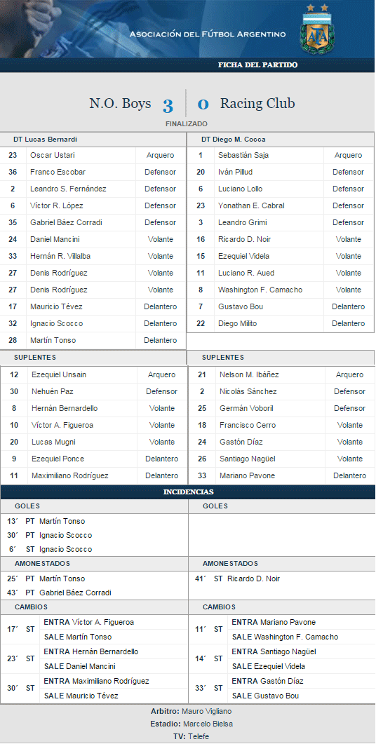 1-0 MARTIN TONSO : después de 2 años sin convertir un gol, Martín Tonso logra ser titular nuevamente desde el arranque y aprovechó la ocación para abrir el marcador y de esta manera conquistar su primer gol en el Torneo, el número 9 con la rojinegra en 104 partidos. Es el primero que le convierte a Racing. El último gol de Martín había sido frente a Boca en la goleada 4-0 por la fecha 15 del Torneo Final 2013.