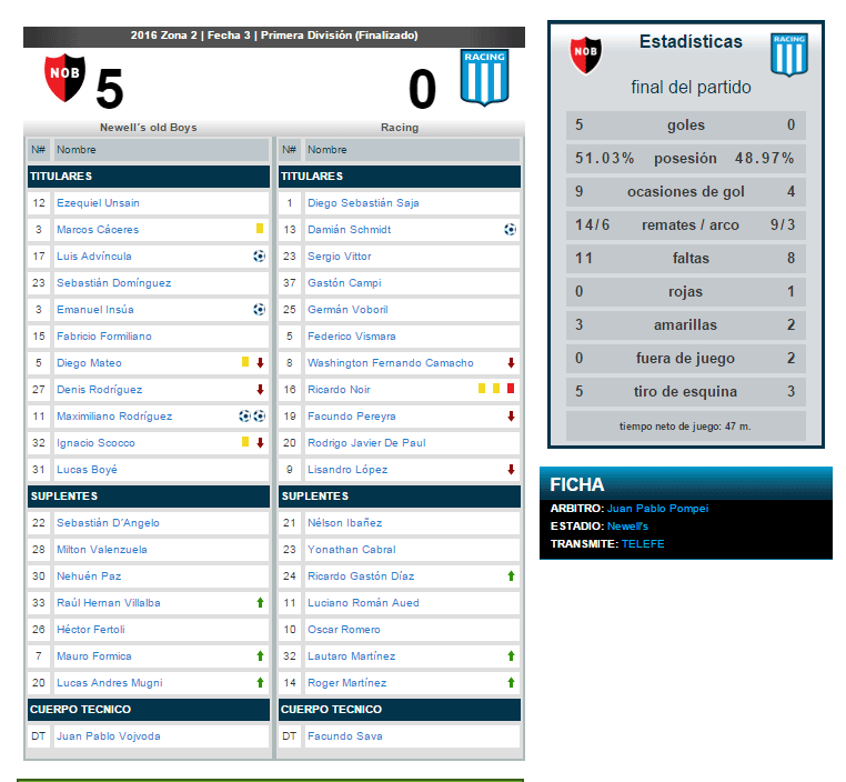 5-0: por Torneos de AFA, desde 1939, la lepra ganó con este marcador en 20 oportunidades, 13 de local y 7 de visitante. El último 5-0 había sido frente a Unión en el Coloso por la fecha 17 del Torneo Final 2013. Con Racing es la primera vez. Y en la historia el primer triunfo 5-0 en AFA fue en el año 1941 frente a Atlanta un 27 de Abril con 4 goles de Canteli y 1 de Morosano.