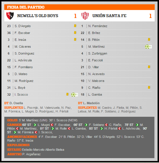 1-1: por Torneos de AFA, desde 1939, la lepra y el Tatengue empataron con este marcador en 5 oportunidades, 3 en Rosario y 2 en Santa Fe. El último 1-1 había sido en la fecha 14 del Apertura 1999, para la lepra marcó justamente Vojvoda a los 25'st y para Unión Cabrol. El último antecedente 1-1 de la lepra fue en la fecha 29 del Torneo 2015 frente a Lanús