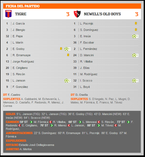 3-3: por Torneos de AFA, la lepra empató con este marcador en 35 oportunidades, 18 de Local y 17 de Visitante. Con Tigre empató en 3 oportunidades 3-3, fueron en 1939 en el 2º partido oficial de la lepra en AFA, luego en 1947 y ahora en 2016. El último 3-3 que se registra es el de la fecha 3 del Torneo Transición 2014 ante Belgrano de Córdoba en el Coloso Marcelo Bielsa. En este 3-3 el juvenil Daniel Mancini convierte su primer gol con la camiseta leprosa. En tanto Insua alcanzó los 2 tantos y es el 2ª goleador leproso del torneo junto a Scocco.