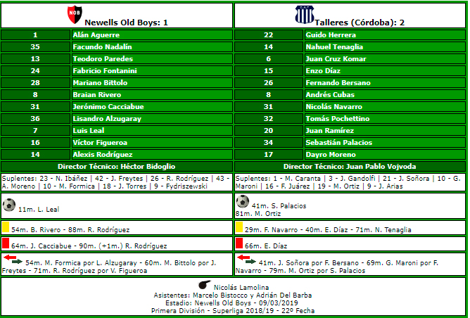 Otro Camaleón que gana : Fue Matías Suarez, autor del 2º gol millonario de cabeza, quien ya le había convertido a Newell's de penal con la camiseta de Belgrano en el triunfo pirata 2-1 en la fecha 29 de la Temporada 2016/2017, ahora es el turno de Sebastián Palacios quien con la casaca de Boca fue autor de unos de los goles tanto en el 0-4 del 2015 como en el 1-4 del 2016. Con la de Talleres vuelve a convertir en un nuevo triunfo y suma 3 goles ante la lepra.