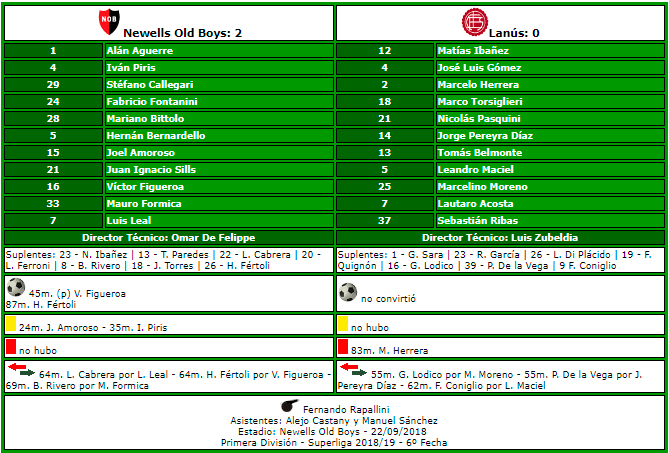 45'PT Victor Figueroa: 1º gol en la Superliga 2018, su anotación nº 18 con la camiseta de la lepra (todos en AFA). Su 1º gol a Lanus . El 2º gol de Penal con la rojinegra en tiempo regular, el anterio fue a Aldosivi en la temporada 2016/2017. También convirtió 1 gol de Penal en la definición por Copa Argentina ante Atlético Tucumán. En su carrera convirtió 4 penales en tiempor regular, 2 en Newell's (convirtió) y 2 en Godoy Cruz (1 gol y 1 desvío). En total 30 goles en toda su carrera deportiva. (Dato Fernando Fracchia).