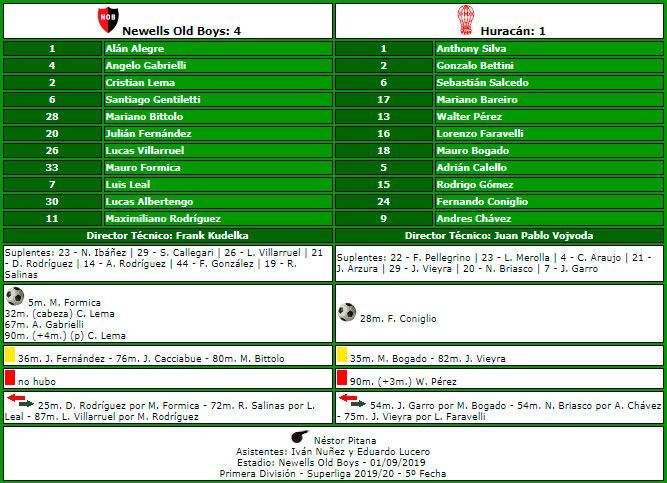 5'PT Mauro Formica: 6º gol de Newell's en esta Superliga 2019/2020. Su 1º gol en la Temporada 2019/20. Su gol Nº 27 en Superliga y el Nº 30 con la casaca rojinegra. Es el 1 º gol que le convierte a Huracán..