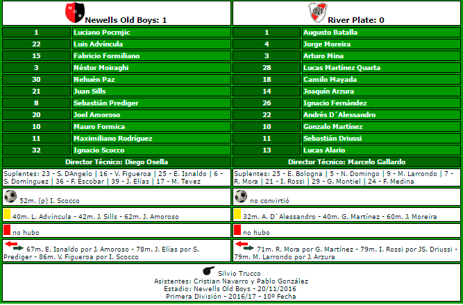 Nacho goleador : Ignacio Scocco le convierte a River el gol número 7 y se mantiene como máximo artillero frente al millonario. Con este gol suma 5 en el torneo y es el máximo goleador leproso. En total suma 68 goles y se posiciona en 6º lugar detrás de Maxi (69) en la tabla de goleadores históricos. Los últimos 3 penales a favor de Newell's los ejecutó Nacho y todos fueron gol. A River le convierte de penal por 2ª vez, la anterior fue en el Torneo Inicial 2012. Nacho no puede ingresar al grupo de verdugos de los denominados grandes, ya que aún no le convirtió goles a Boca.