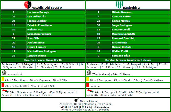 Osella y otra derrota: En el grupo de los 15, Diego se ubica 6º al cabo de 24 partidos dirigidos y comparte linea con Alfredo Berti. A pesar de la 2º derrota de la temporada, su perfomance sigue siendo muy buena, con el 66,67 % de efectividad. En cuanto a la condiciòn de local, Osella pierde su 2º partido en el Coloso. La primera derrota había sido ante Defensa y Justicia en el anterior Torneo 2016 en la fecha 14 por 0-1. No obstante la estadística marca 13 partidos dirigidos en el Marcelo Bielsa con 2 derrotas, 5 empates y 6 victorias. Osella se fue expulsado por 1º vez desde que es técnico leproso. Pitana le muestra el cartón colorado a los 90' del partido. Luego se iría expulsado el jugador leproso Sills.