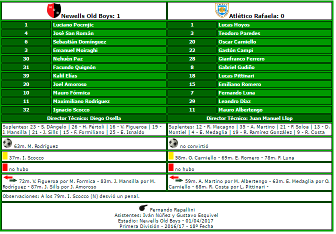 Rappallini un tema aparte: El árbitro del partido pese a los esfuerzos realizados para evitar el triunfo leproso, tuvo que pitar el final del encuentro con la primera victoria leprosa bajo su arbitraje. En total dirigió a Newells en 10 oportunidades, perdimos 5, empatamos 4 y logramos el 1º triunfo. |