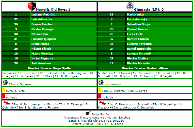 Volvió Victor : Figuero recuperó la titularidad y agradeció con un gol que le dió el triunfo a los de Osella. Es su gol Nº 14 con la rojinegra, el primero en este Torneo, el Nº 7 de Newells en la temporada 2016 / 2017. Victor no convertia desde el 21/04/2015 frente a Godoy Cruz en la victoria 2-0 leprosa. Le convierte a Gimnasia por primera vez con la rojinegra.