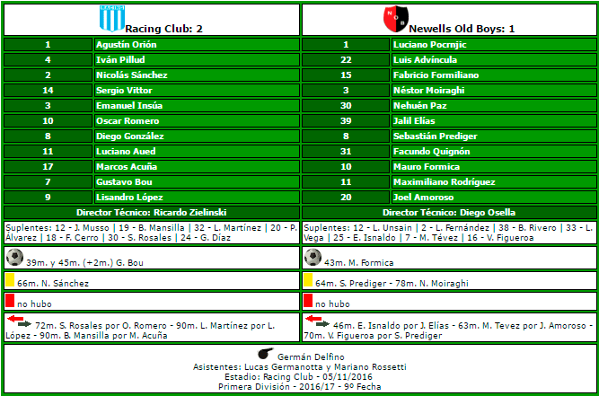 1-2: 10 veces la lepra perdió 1-2 frente a Racing, fueron 7 en el Cilindro y 3 en el Coloso Marcelo Bielsa. La última derrota con este marcador había sido en el Clausura 2009. De esta manera la lepra rompe una racha de 8 partidos sin perder frente a Racing con 6 victorias y 2 empates. En las anteriores 2 presentaciones, el equipo rojinegro le convirtió a la academia 8 goles y no recibió ninguno en contra. En el partido anterior, el marcador fue 5-0 registrándose la máxima goleada histórica frente a Racing de la mano de Vojvoda.