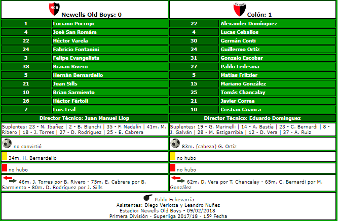 TORNEOS> AFA > SUPERLIGA 2017 / 2018 - FECHA 15 - 09/02/2018 - Viernes 21:10 Hs - ARBITRO: Pablo Echevarria
