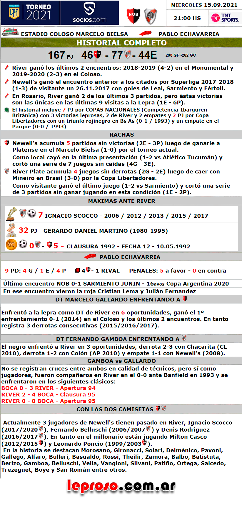 MARCELO GALLARDO : Enfrentó a la lepra como DT de River en 7 oportunidades, ganó el 1º enfrentamiento 0-1 (2014) en el Coloso y luego de 3 derrotas consecutivas, registra 3 triunfos consecutivos (2 en 2019 y 2021). |