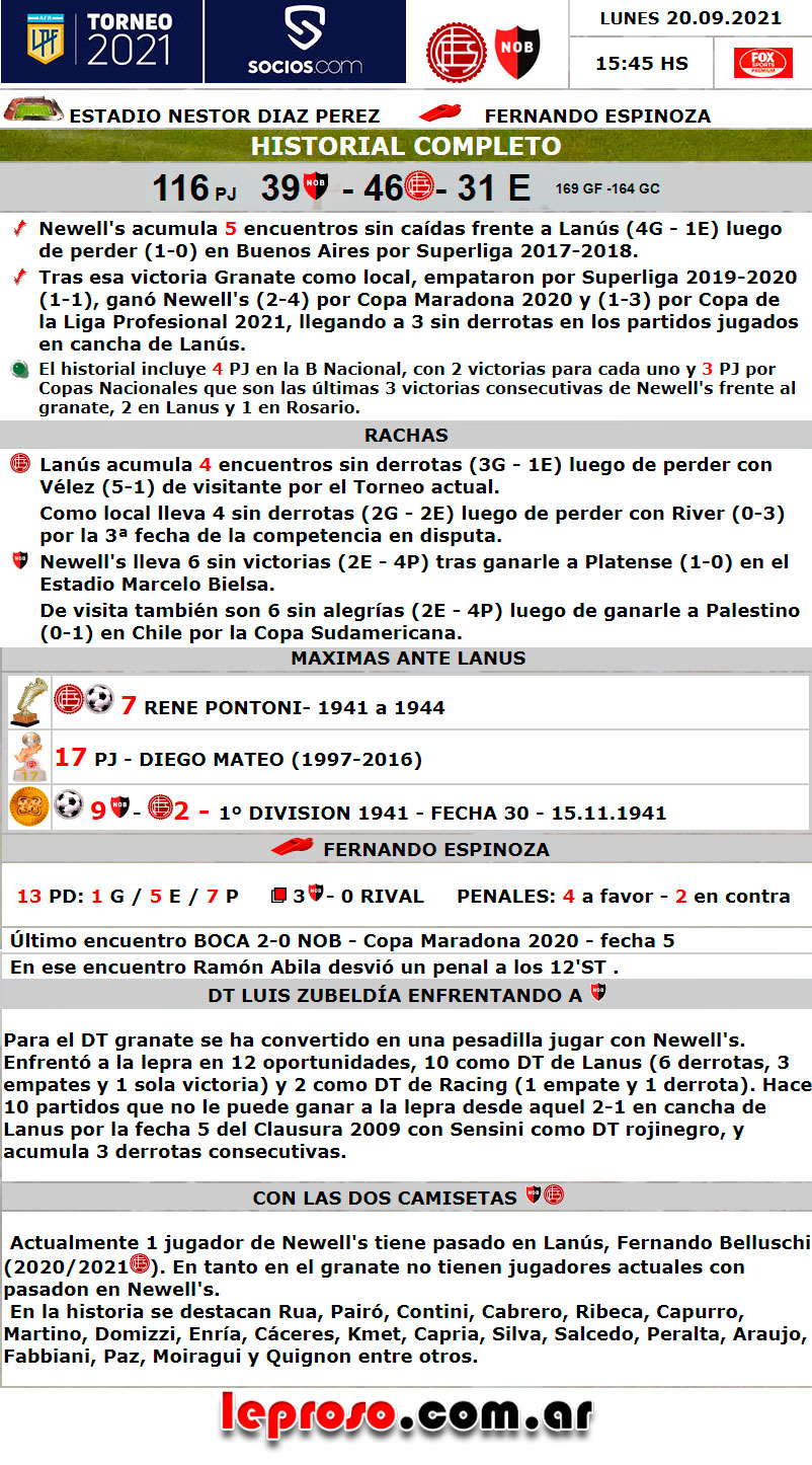 LUIS ZUBELDÍA : Para el DT granate se ha convertido en una pesadilla jugar con Newell's. Enfrentó a la lepra en 13 oportunidades, 11 como DT de Lanus (7 derrotas, 3 empates y 1 sola victoria) y 2 como DT de Racing (1 empate y 1 derrota). Hace 11 partidos que no le puede ganar a la lepra desde aquel 2-1 en cancha de Lanus por la fecha 5 del Clausura 2009 con Sensini como DT rojinegro, y acumula 4 derrotas consecutivas. |