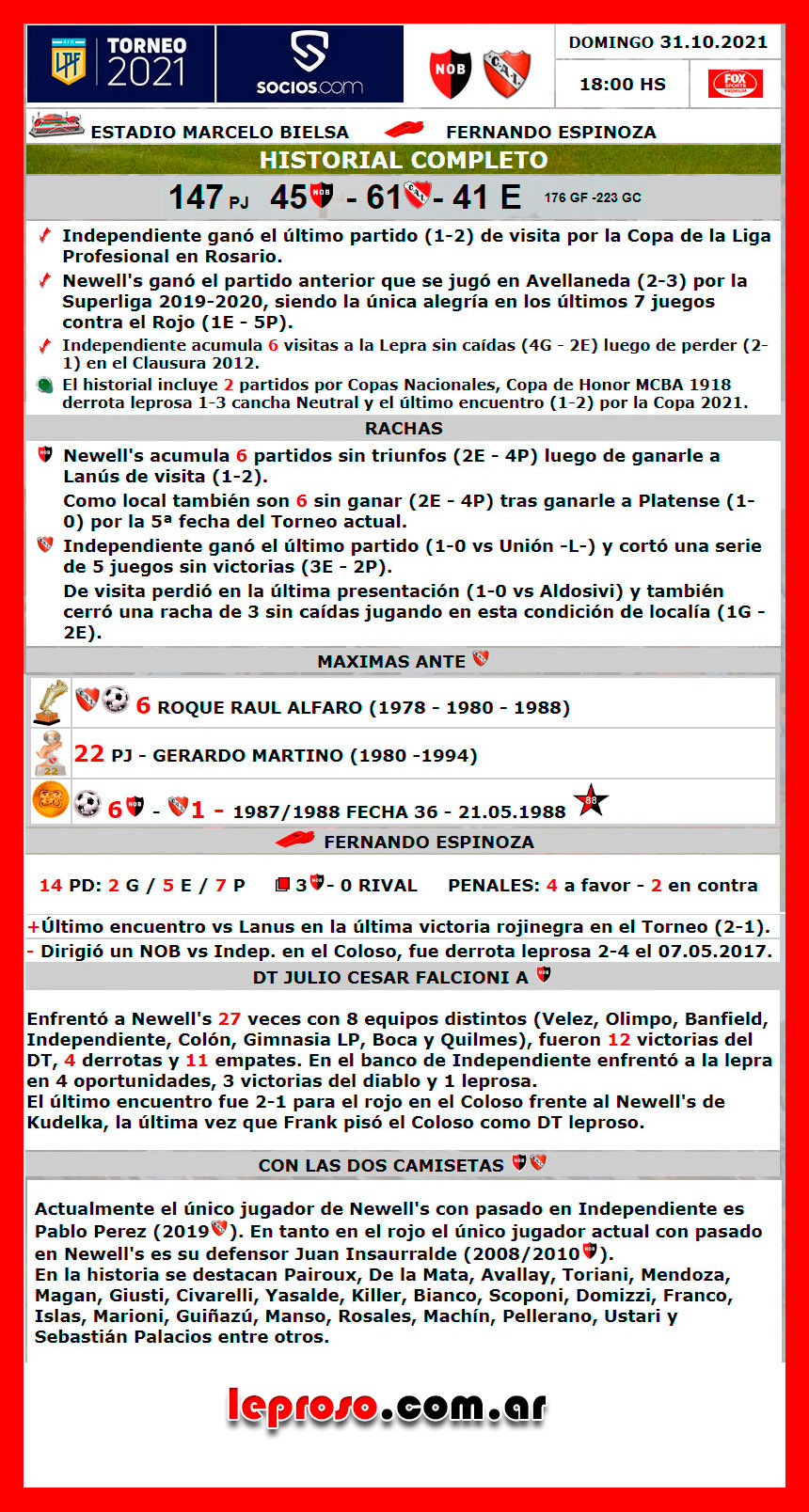 JULIO CESAR FALCIONI : Enfrentó a Newell's 28 veces con 8 equipos distintos (Velez, Olimpo, Banfield, Independiente, Colón, Gimnasia LP, Boca y Quilmes), fueron 12 victorias del DT, 5 derrotas y 11 empates. En el banco de Independiente enfrentó a la lepra en 5 oportunidades, 3 victorias del diablo y 2 leprosa.