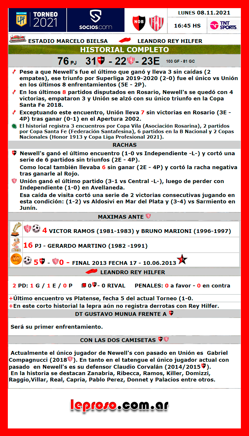 ADRIAN TAFFAREL: los resultados lo acompañan en este últmo tramo y logra 2 victorias consecutivas de local, 3 partidos invictos en el Coloso y 278' con el arco en 0 en el Marcelo Bielsa. Alcanza una efectividad del 58,33 % superior a la media, con 2 victorias, 1 empate y 1 derrota (7 puntos de 12). Hizo debutar a otro juvenil, Martin Luciano, de esta manera suman 5 los debutantes en la era Taffarel y todos surgidos de la cantera leprosa (Benitez, Campagnaro, Jacob, Bravo y Luciano), superando a Germán Burgos quien fuera el útimo DT que hizo debutar 4 juveniles (Acevedo, Calcaterra, Jaime y Leyendeker).