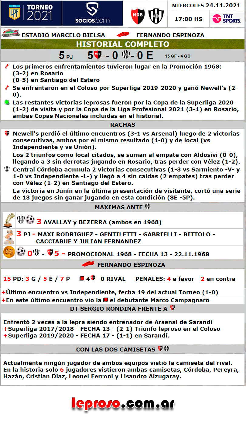 La lepra le gana por 6º vez consecutiva desde el inicio del Historial al ferroviario de Santiago del Estero, único caso en la historia de Newell's en AFA por Torneos Regulares. Los antecedentes que superan los 6 encuentros son todos de la era del amateurismo entre 1905 y 1931. |