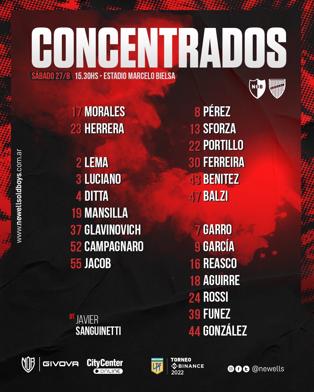 JAVIER SANGUINETTI : 32 partidos dirigiendo a la lepra. Suma 14 victorias , 7 empates y 11 derrotas. En AFA 43 puntos sobre 90 (47.77 % de efectividad). En la tabla comparativa de técnicos históricos en sus primeros 32 partidos dirigiendo a Newell (28 DT en total), Archu se ubica en el 11 º lugar. Entre la pécima performance de su equipo y los insultos de la barra brava en el playón, Archu decidió luego del partido dar un paso al costado y renunció al cargo de DT rojinegro.