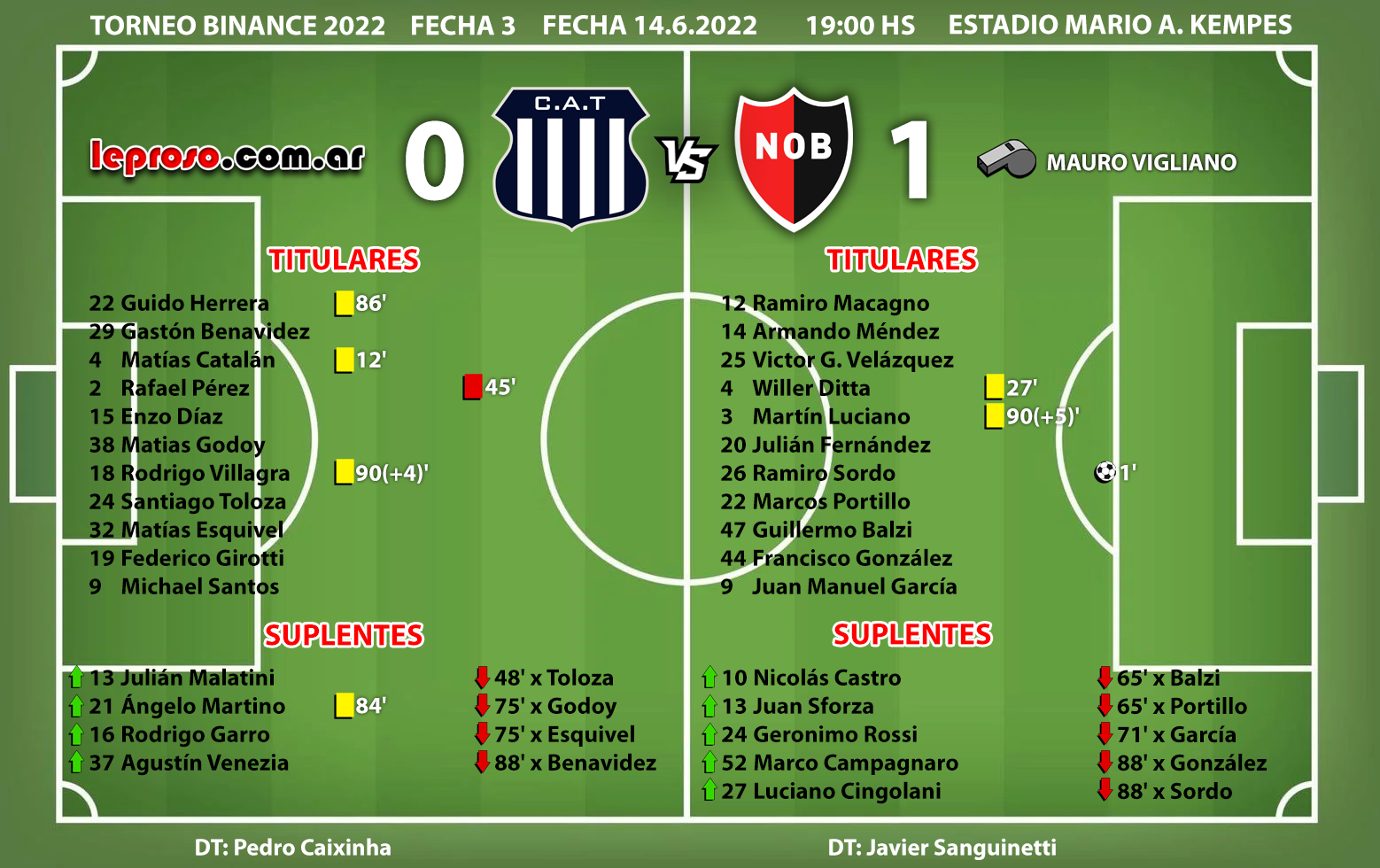 JAVIER SANGUINETTI : 18 partidos dirigiendo a la lepra. Suma 10 victorias , 3 empates y 5 derrotas.. Gran comienzo de Torneo 2022 , triunfo ante el Taladro, empate en 0 frente al Ciclón y nueva victoria en el Kempes, 7 puntos de 9 (77,77 % efectividad) y alcanza la punta del torneo junto a Platense y Estudiantes. |