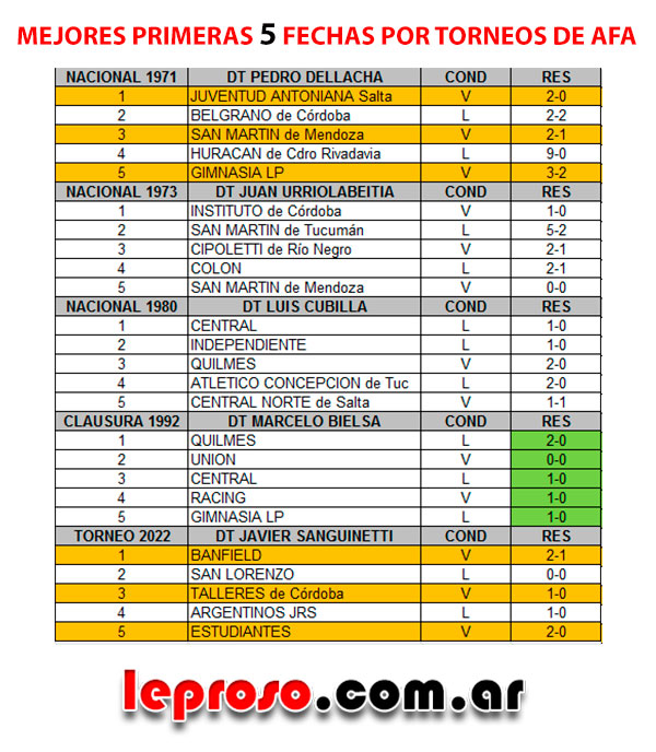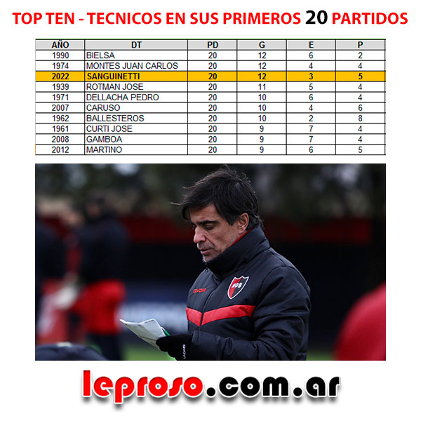 JAVIER SANGUINETTI : 20 partidos dirigiendo a la lepra. Suma 12 victorias , 3 empates y 5 derrotas. En AFA 36 puntos sobre 57 (63,15 % de efectividad). Gran comienzo de Torneo 2022 , Archu se encuentra entre los 5 mejores comienzo de torneos en sus primeras 5 fechas.