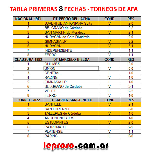 La lepra no llegaba invicta a la fecha 8 de un Torneo desde el Clausura 1992 con el loco Marcelo Bielsa que a diferencia de Archu lo hacía con 6 victorias y 2 empates, y el primer antecedente se dió con Pedro Dellacha en el Nacional 1971 con 5 victorias y 3 empates. |