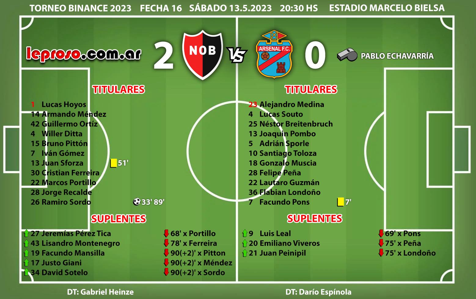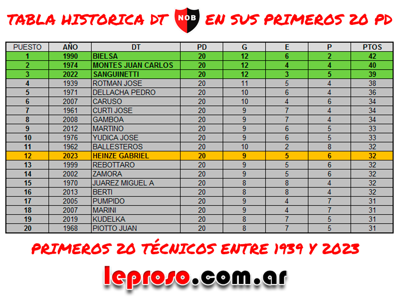 GABRIEL HEINZE : dirigió su 20º partido oficial en Newell's sumando la derrota ante Claypole por Copa Argentina, los 3 triunfos por Copa Sudamericana y las primeras 16 fechas del Torneo Binance 2023, en total 9 victorias, 6 derrotas y 5 empates. En el torneo local Binance 2023, lleva un total de 6 victorias, 5 derrotas y 5 empates con una efectividad del 47,96 %. TABLA COMPARATIVA DT |