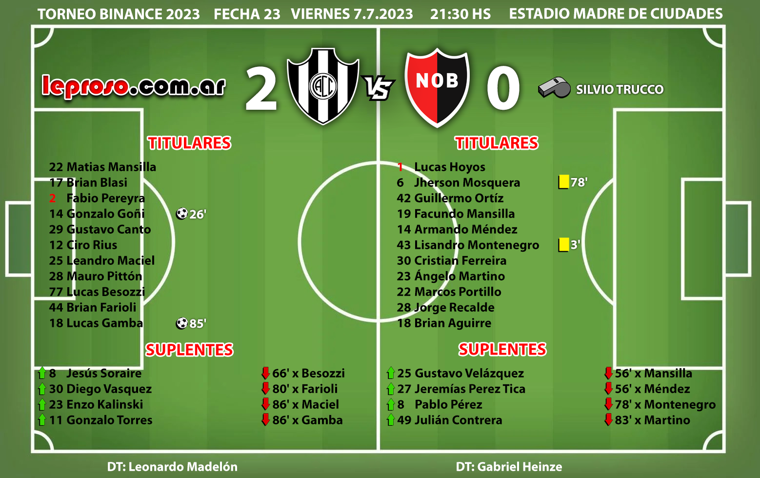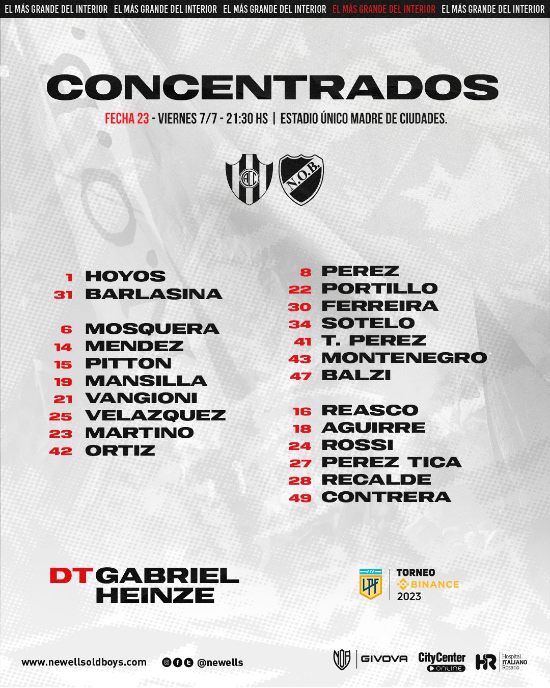 GABRIEL HEINZE : dirigió su partido oficial Nº 30 en Newell's sumando la derrota ante Claypole por Copa Argentina, los 6 partidos de Copa Sudamericana y las 23 fechas del Torneo Binance 2023, en total 12 victorias, 8 derrotas y 10 empates. En el torneo local Binance 2023, lleva un total de 7 victorias, 7 derrotas y 9 empates con una efectividad del 43,48 %. |