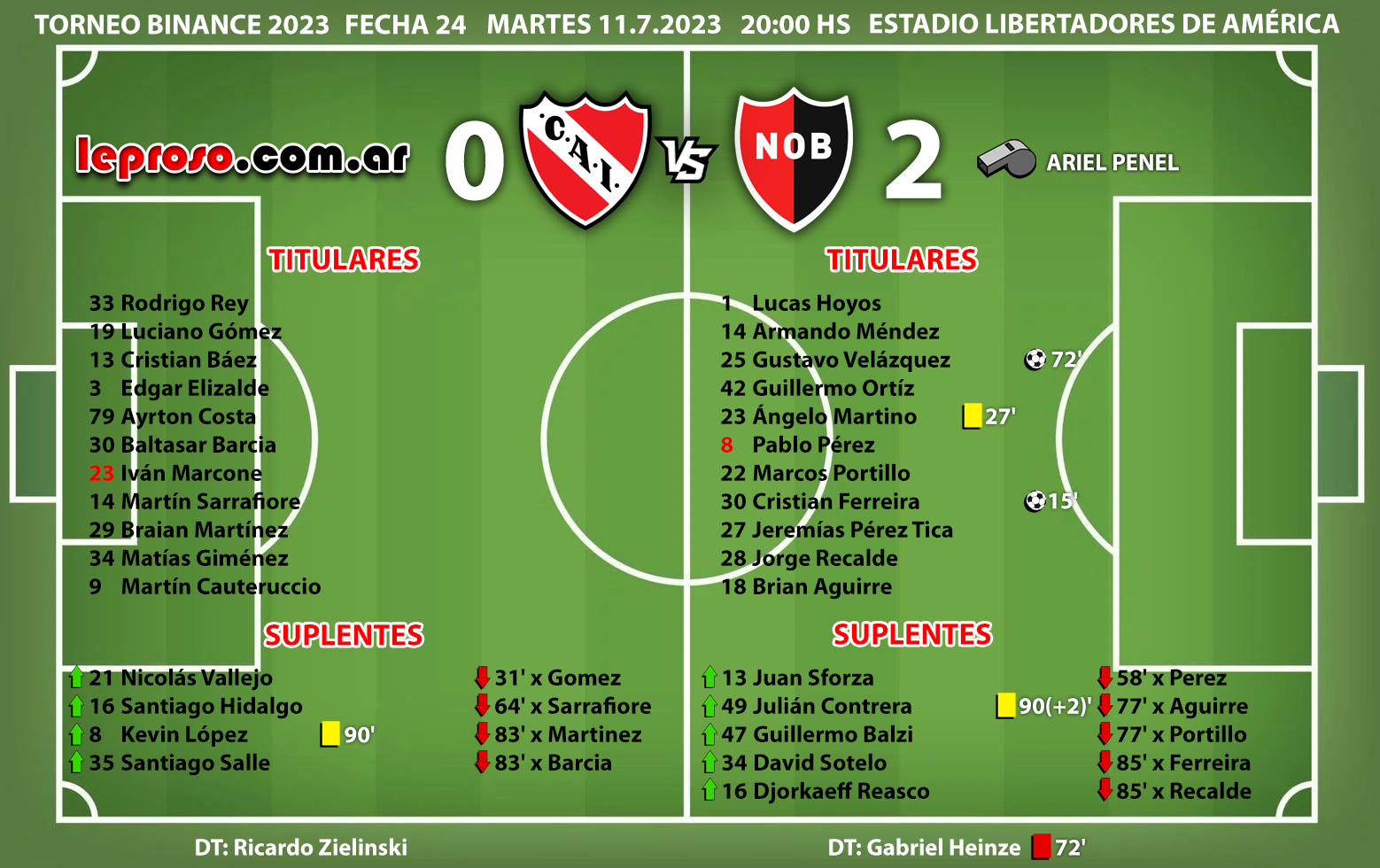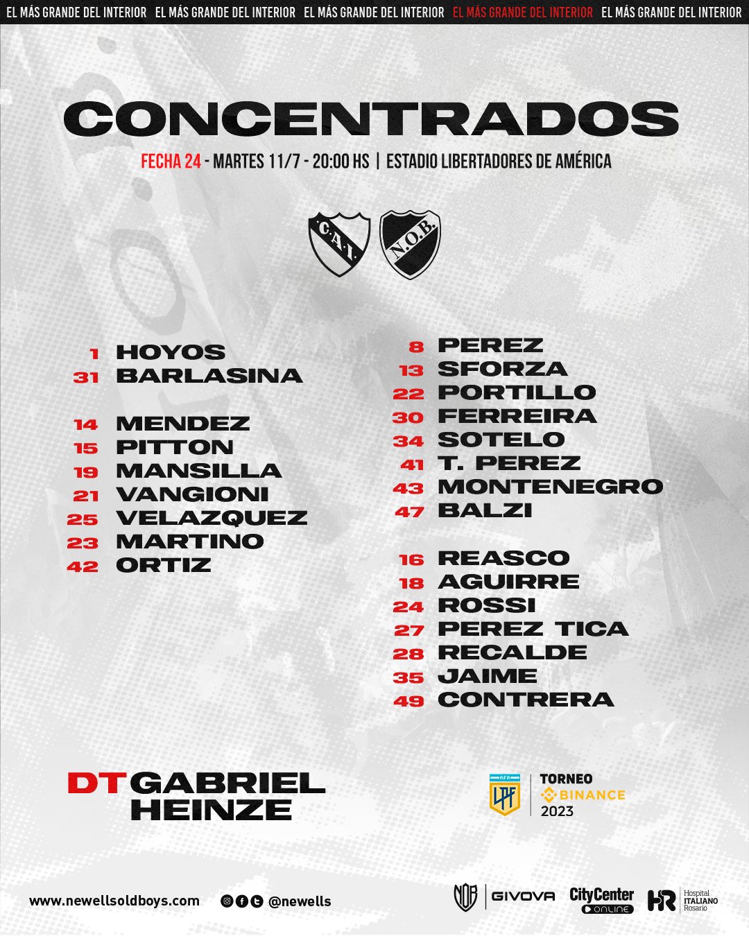GABRIEL HEINZE : dirigió su partido oficial Nº 31 en Newell's sumando la derrota ante Claypole por Copa Argentina, los 6 partidos de Copa Sudamericana y las 24 fechas del Torneo Binance 2023, en total 13 victorias, 8 derrotas y 10 empates. En el torneo local Binance 2023, lleva un total de 8 victorias, 7 derrotas y 9 empates con una efectividad del 45,83 %. |