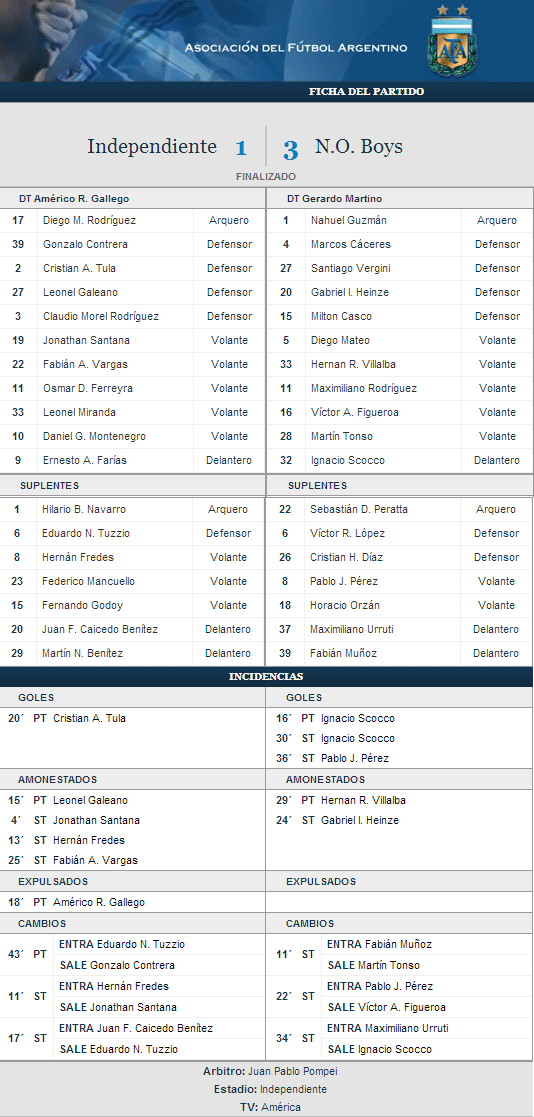 11 PARTIDOS SIN PERDER DE VISITANTE - OTRO RECORD IGUALADO: El equipo del Tata no tiene límites en materia estadística, ya alcanzó la mejor racha fuera del coloso lograda entre 1990 y 1991 por el Loco Bielsa. 11 fechas sin conocer la derrota en condición de visitante. 4 PARTIDOS CONSECUTIVOS HACIENDO GOLES: Scocco en el Torneo Inicial 2012 había igualado la marca de Joaquín Boghossián quien en el Apertura 2009 hizo un gol por partido desde la fecha 15 hasta la 18. Pero a diferencia del uruguayo, en dicha oportunidad Ignacio sumó 5 goles, uno más que Boghossián. Pero ahora Nacho gol superó su propio record, ya que volvió a convertir en 4 partidos consecutivos pero ahora suma 6 goles, con lo cual obtiene un nuevo record en Torneos Cortos de AFA para un jugador rojinegro, 6 goles en 4 partidos consecutivos. SITUACION ACTUAL: la lepra de Martino suma 4 partidos sin perder con 3 triunfos consecutivos y 3 goles en cada victoria. De visitante suma su segunda victoria consecutiva.