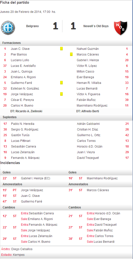 1-1 EL RESULTADO: Por torneos cortos empatamos 1-1 en 152 oportunidades, 75 de local y 77 de visitante. El último empate 1-1 fue el 24/11/2013 frente a Arsenal en el Coloso por la fecha 17 del Torneo Inicial 2013. En 32 partidos jugados con Belgrano en toda la historia de Newell's en AFA, es la primera vez que empatan 1-1. Habían empatado 4 veces 0-0 y una vez 2-2.