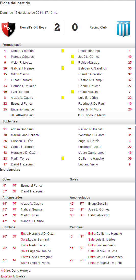 HERRERA Y NEWELL'S: El árbitro Dario Herrera dirigió a la lepra en 4 oportunidades con 3 victorias leprosas (2 de local y 1 de visitante) y 1 derrota fuera del Coloso. En esa única derrota, fue expulsado el DT Alfredo Berti, en la fecha 2 del actual Torneo en la derrota 3-0 en La Plata ante Gimnasia. Cobró un penal a favor que Maxi Rodriguez lo transformó en gol (NOB 2-1 OLIMPO fecha 7 INICIAL 2013) y cobró un penal en contra que le atajó Guzmán a José Correa de Gimnasia LP en la fecha 2 del actual torneo, derrota leprosa 3-0 frente al lobo.