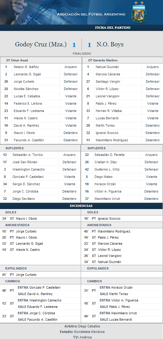 SCOCCO LIDER EN LA TABLA DE GOLEADORES:con el golazo de larga distancia ante Godoy Cruz, Nacho sigue siendo el goleador leproso y máximo goleador del torneo con 9 goles. Jamás en la historia de los torneos Cortos de AFA un jugador leproso se consagró goleador del mismo. Esta puede ser una posibilidad histórica de lograrlo. Los máximos anotadores leprosos en un torneo Corto son Tacuara Cardozo (AP 2006) y Joaquín Boghossián (AP 2009) ambos con 11 goles. Nacho está a solo 2 tantos de igualar esa marca. Pero con este gol, Scocco también tiene chances de igualar el record en Cortos de Ivan Gabrich que sumó 30 goles entre los años 1991 y 1996. Con el tanto conquistado en Mendoza, Nacho suma 25 goles en AFA y está a solo 5 del record. Con los 4 goles convertidos por Copa Libertadores, Scocco suma 29 goles con la rojinegra. Este es su primer gol al Tomba.