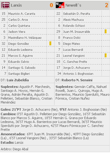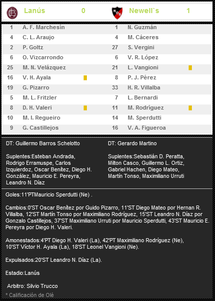 SPERDUTTI Y EL GOL : el Gordo se reencontró con el gol y le dió la victoria al equipo del Tata. Su último grito también le había dado la victoria el conjunto rojinegro. Fue en la fecha 6 del Clausura 2012 ante Atlético Rafaela (1-0). Con este gol abre la tabla de goleadores rojinegros del presente torneo y suma 14 tantos en su carrera con la casaca leprosa. A Lanús ya le había convertido hace 2 años, el 14/08/2010 pero en dicha oportunidad el resultado fue 1-1 en el mismo estadio.